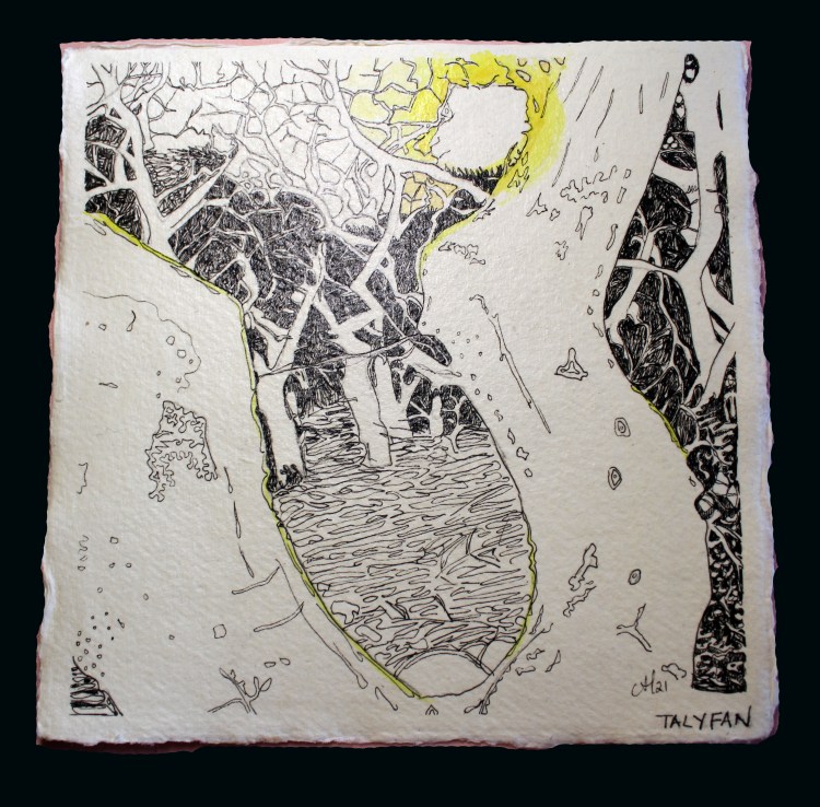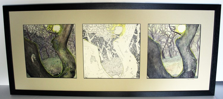There is a public right of way through the woodlands, a route i have walked through regularly, this art piece reflects my winter walks throughout 2020 and the Covid lockdown.