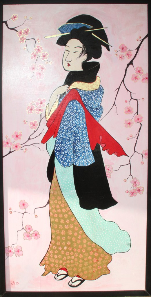 The Japanese word geisha or geiko literally translates “art person,” professional women who entertained men; singing, dancing, and playing the samisen a three stringed instrument! They were adept at flower arranging, performing the tea ceremony, calligraphy and communication!. They wore white face makeup because it looked better in the light, particularly if they were to perform to or entertain nobles. In the dim candlelight, wearing thick white makeup created a porcelain look!