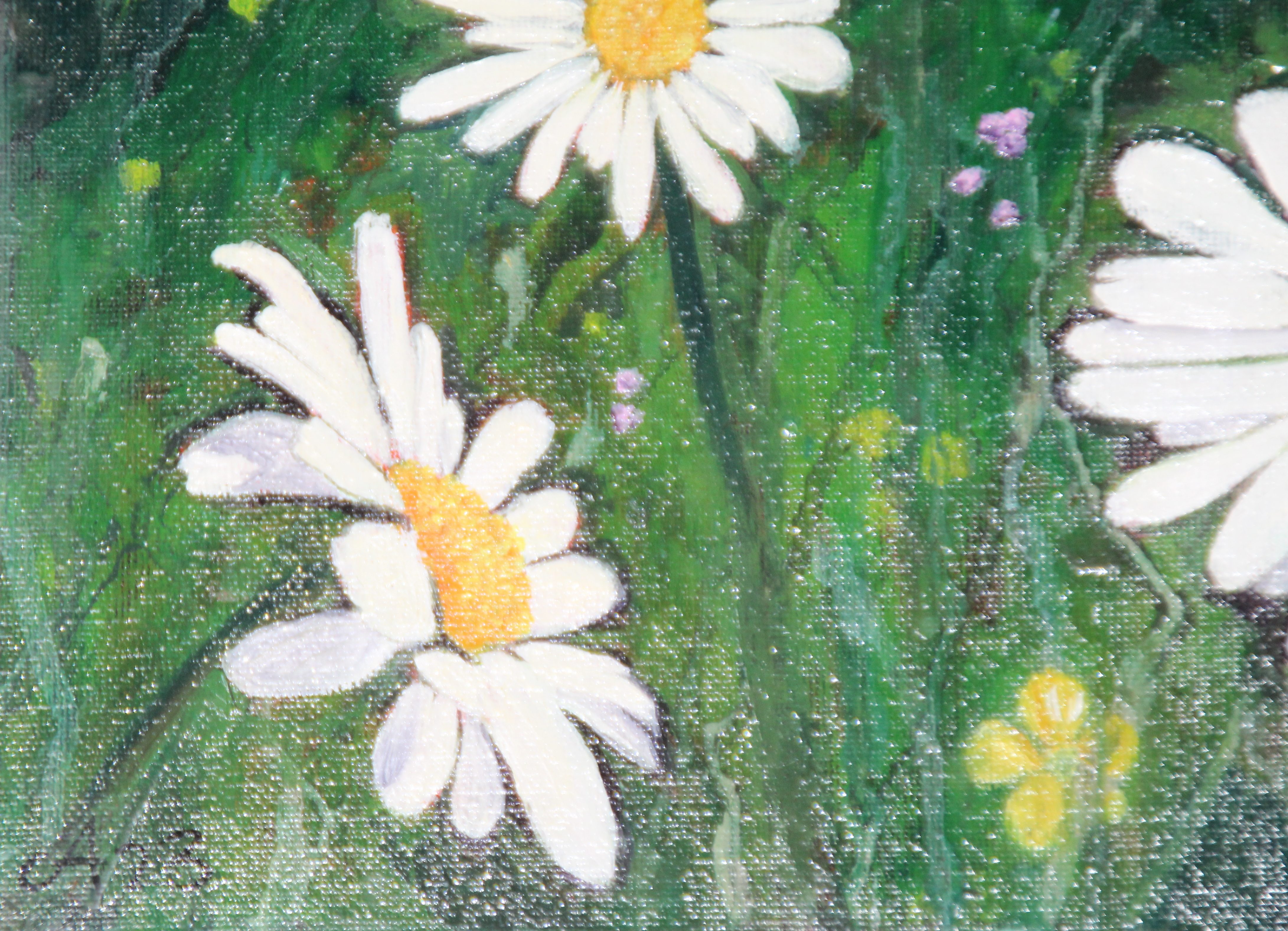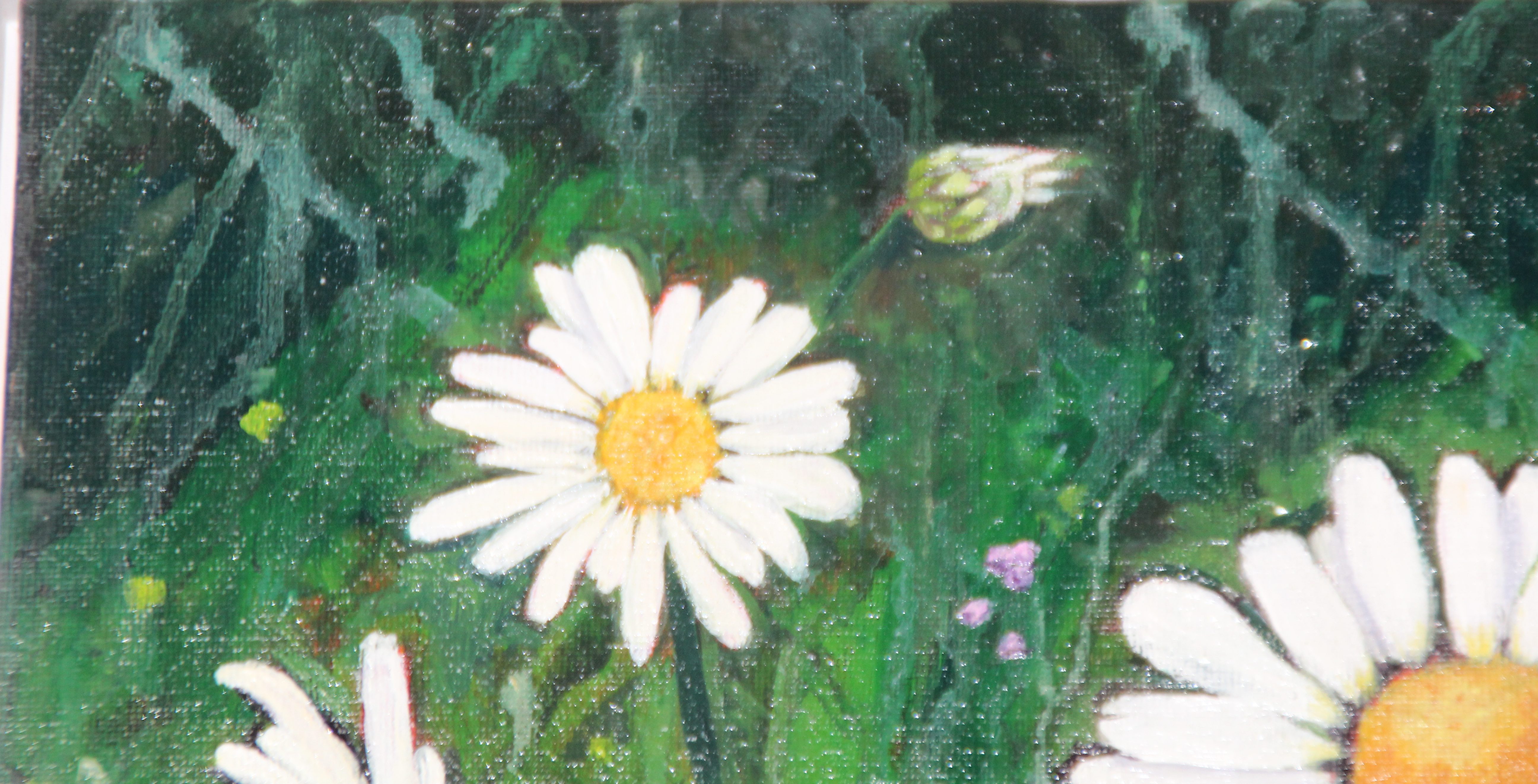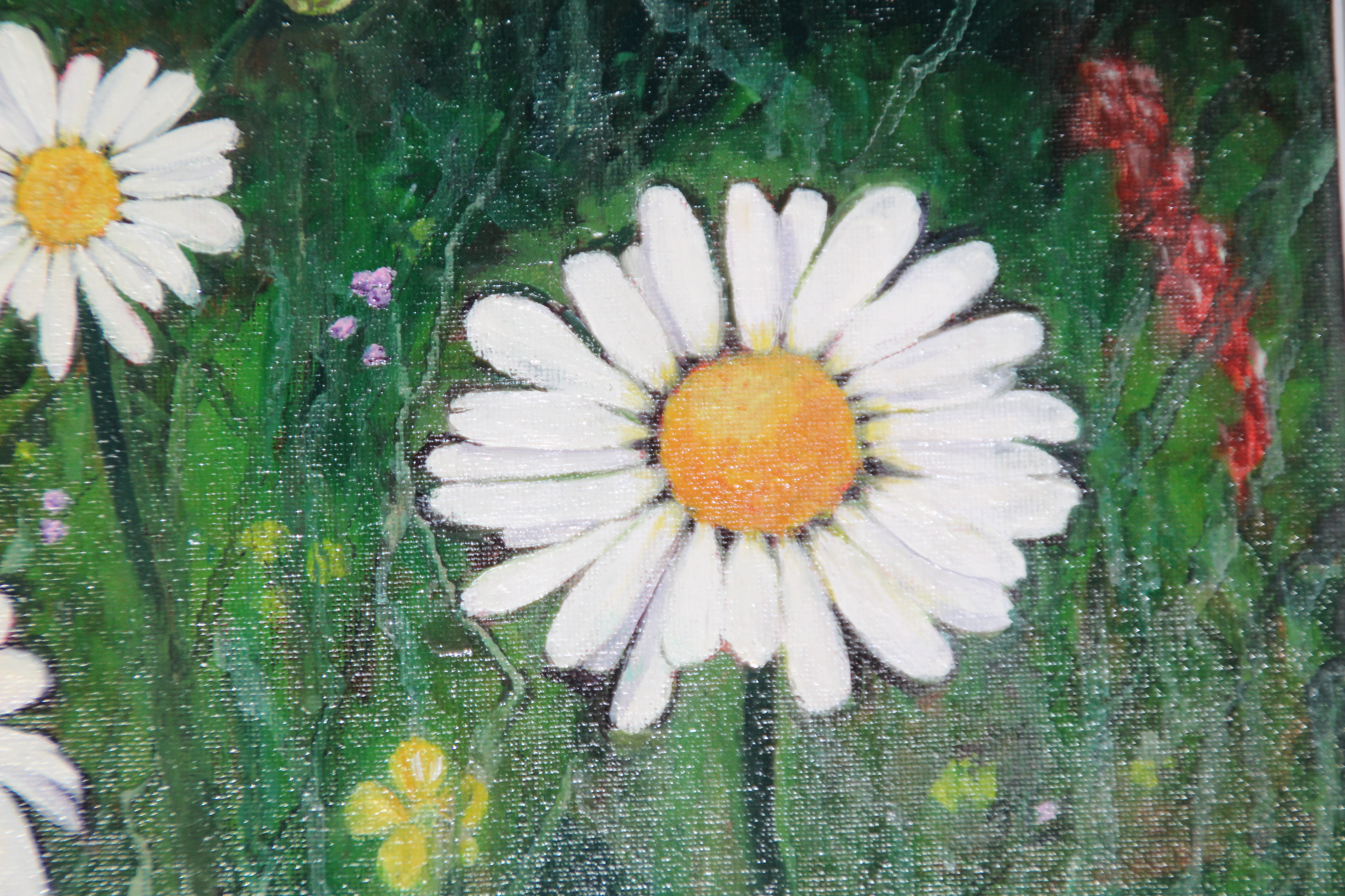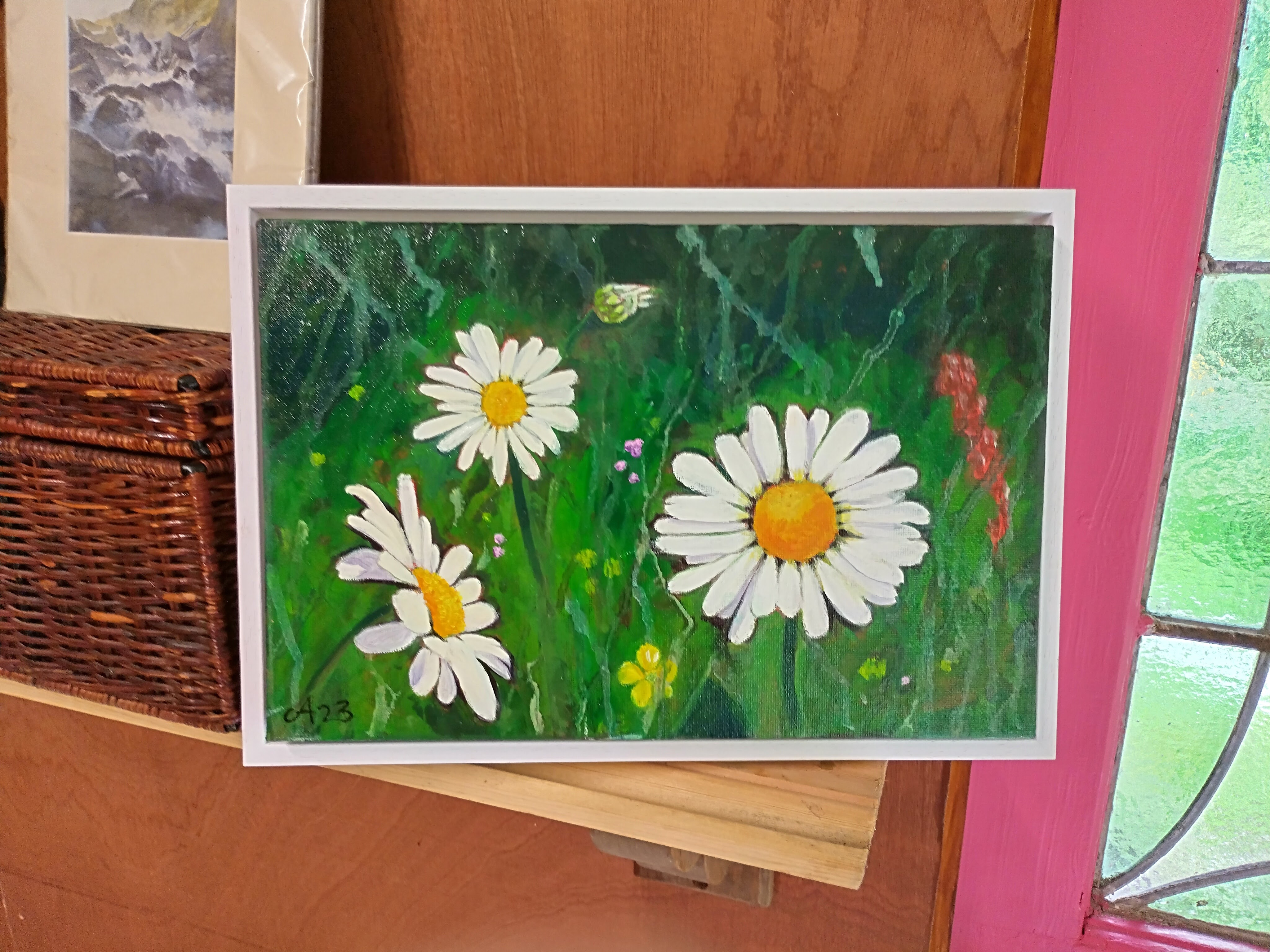 Daisies, Llygaid y dydd ( literally the days eyes) , Oil on canvas, framed in white frame.