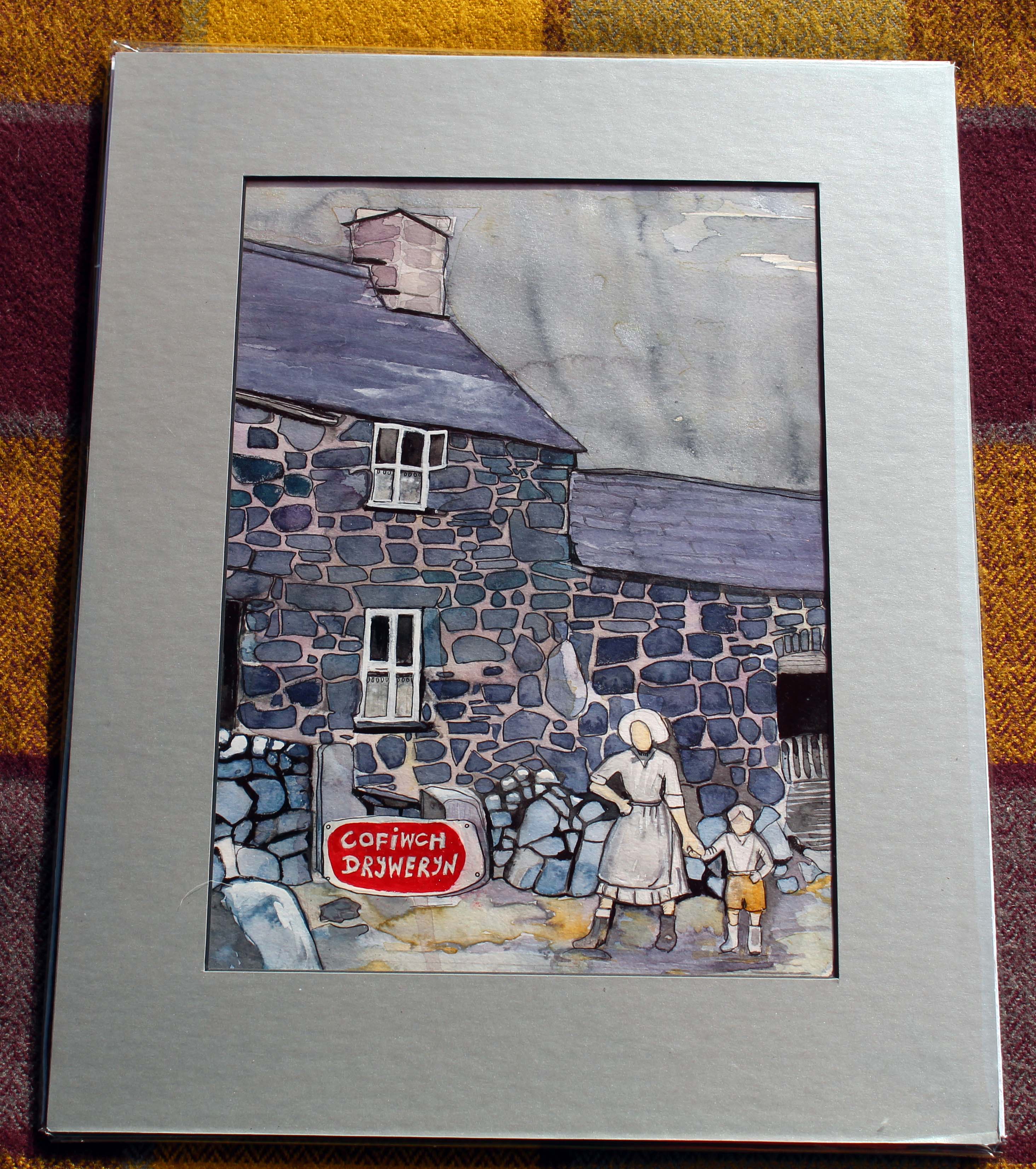 Capel Celyn was a Welsh speaking rural community to the north west of Bala in the Tryweryn valley. The valley was flooded in the 1960’s to supply the Liverpool Corporation with water. Nearly 70 residents lost their home, despite Wales wide opposition to the private members bill. All but one Welsh MP voted against the motion. The Cofiwch Dryweryn (Remember Tryweryn) mural was painted on a wall at Llanrhystud near Aberystwyth by Meic Stephens in 1963. In 2019 the mural was repeatedly vandalised which sparked the painting of 100’s of “Cofiwch Dryweryn” murals across Wales and globally! This is a watercolour of a Capel Celyn cottage, with the faceless family looking over the “Cofiwch Dryweryn” plaque painted across the entrance of the cottage gate, faceless but not forgotten!