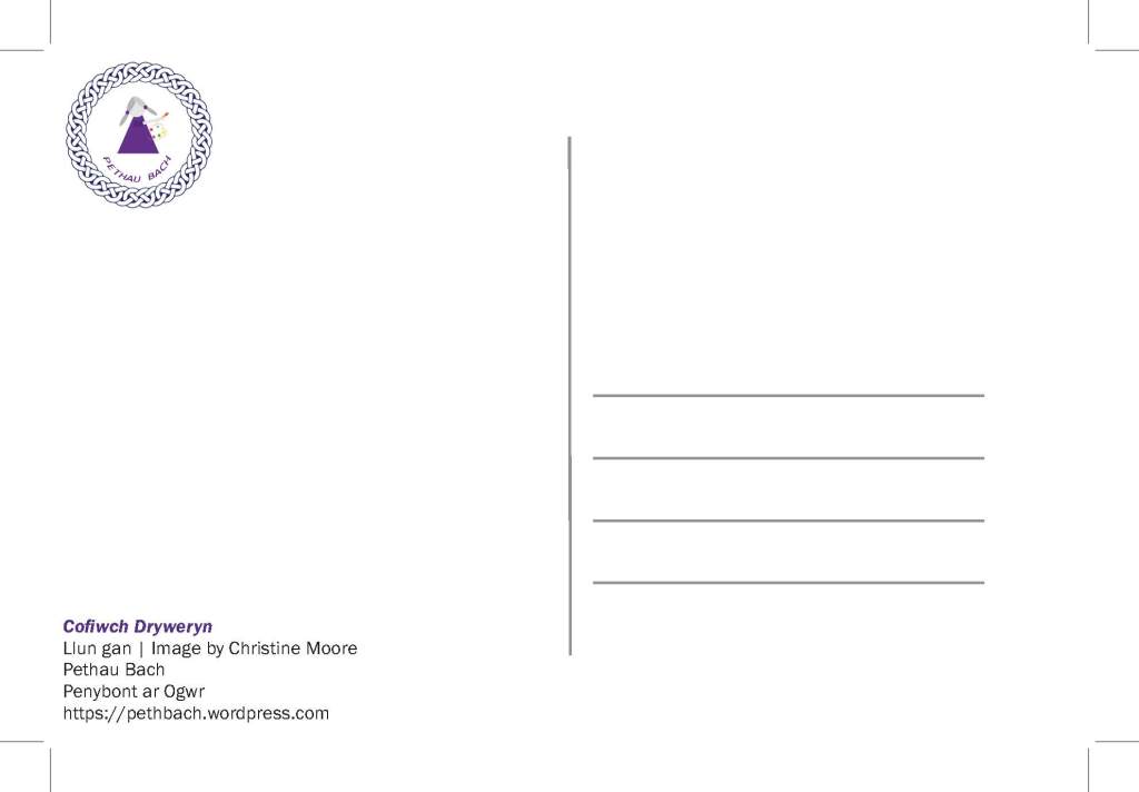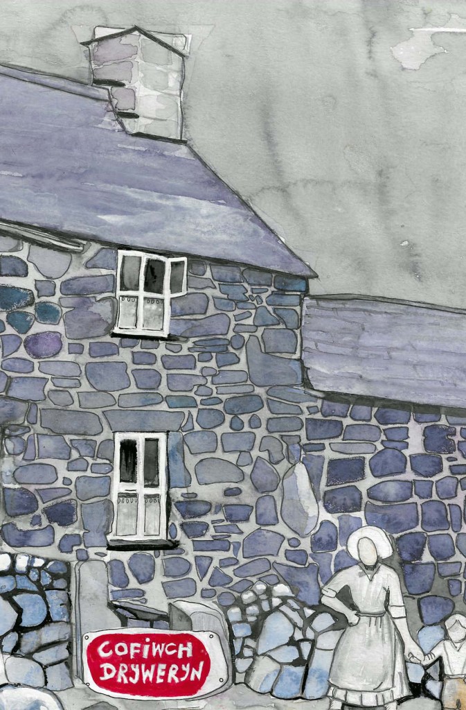 Capel Celyn was a Welsh speaking rural community to the north west of Bala in the Tryweryn valley. The valley was flooded in the 1960’s to supply the Liverpool Corporation with water. Nearly 70 residents lost their home, despite Wales wide opposition to the private members bill. All but one Welsh MP voted against the motion. The Cofiwch Dryweryn (Remember Tryweryn) mural was painted on a wall at Llanrhystud near Aberystwyth by Meic Stephens in 1963. In 2019 the mural was repeatedly vandalised which sparked the painting of 100’s of “Cofiwch Dryweryn” murals across Wales and globally! This is a watercolour of a Capel Celyn cottage, with the faceless family looking over the “Cofiwch Dryweryn” plaque painted across the entrance of the cottage gate, faceless but not forgotten!