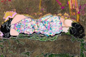 This is a mixed media artwork: pen, watercolour and experimenting with gold leaf, inspired by the amazing Gustav Klimt. Gold of course has been mined in Wales for over 2,000 years and gold jewellery was used by the wealthy and high ranking people of ancient times as a mark of their status. The workmanship of the goldsmiths was of exceptional standards, producing some remarkable pieces.