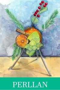 On New Years day, children would go around all the farms and cottages singing for some ‘calennig’ (money). They would carry a ‘perllan’ which was an apple with three pieces of wood stuck in the bottom and then decorated. This would then be placed on the mantle piece or given as a present for good luck. I made my own perllan from an orange and items pinched from the Christmas decorations! This is a watercolour of my perllan.