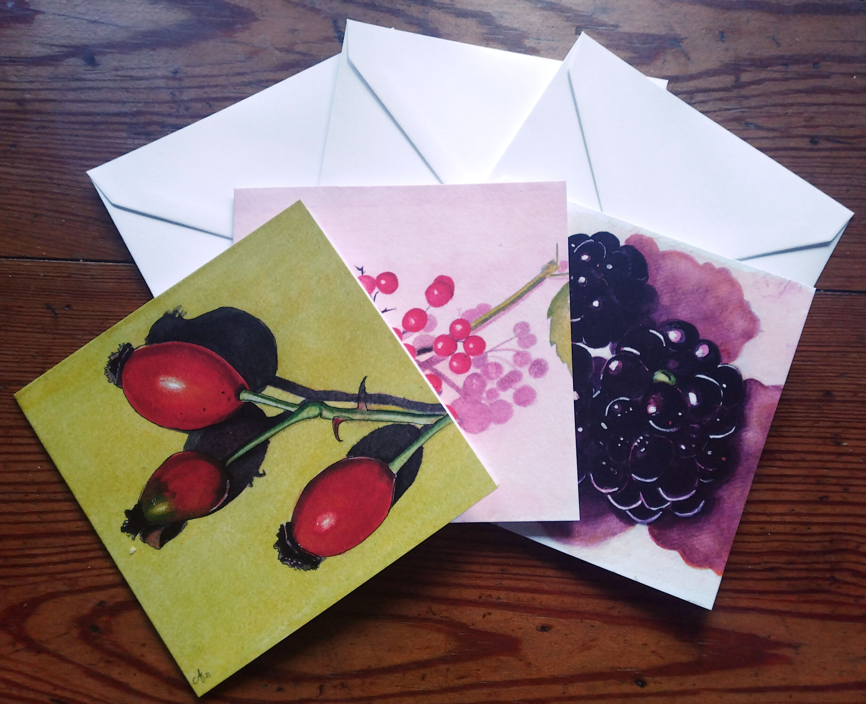 Set of 3 cards from the original watercolour paintings; rosehips, blackberry and guelder rose berries. 5in x 5in cards and white envelopes. Blank. Price includes postage